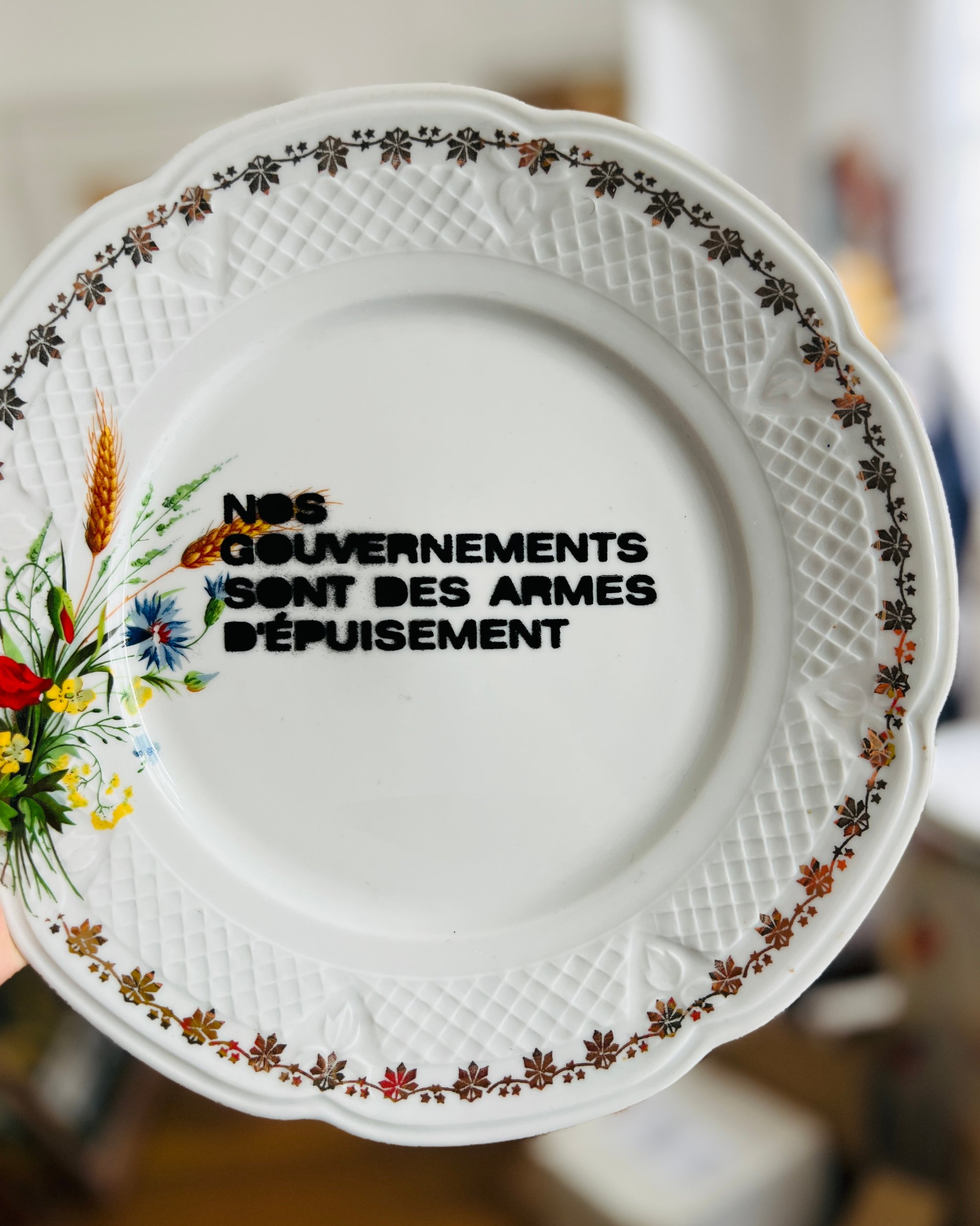 Assiette vintage avec un slogan réalisé au pochoir avec de la peinture en bombe noire. L'assiette est ensuite vernie. (Un crochet pour la suspendre au mur est disponible sur le site pour 5€) Diamètre 24cm