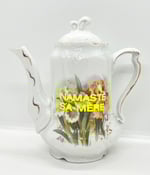 Belle théière ancienne décorée d'iris avec un slogan de la Furieuse Company.