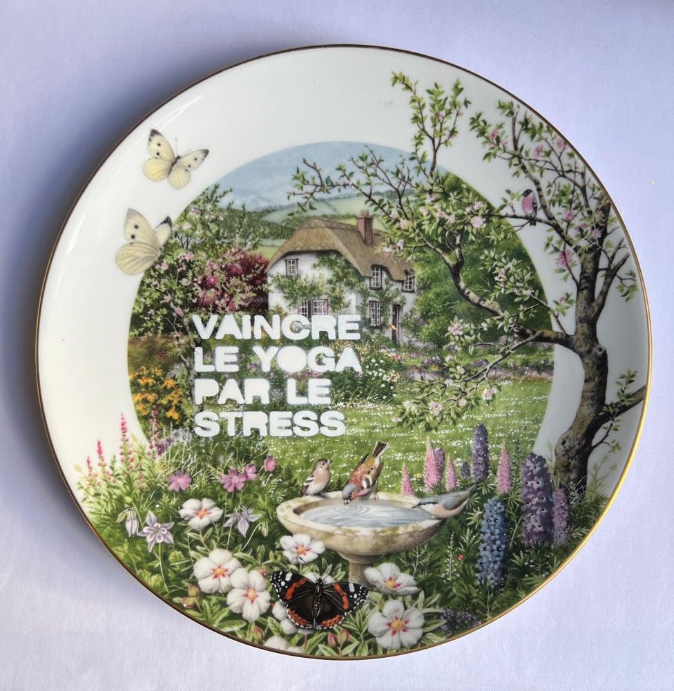 Slogan VAINCRE LE YOGA PAR LE STRESS sur une très belle assiette vintage numérotée.