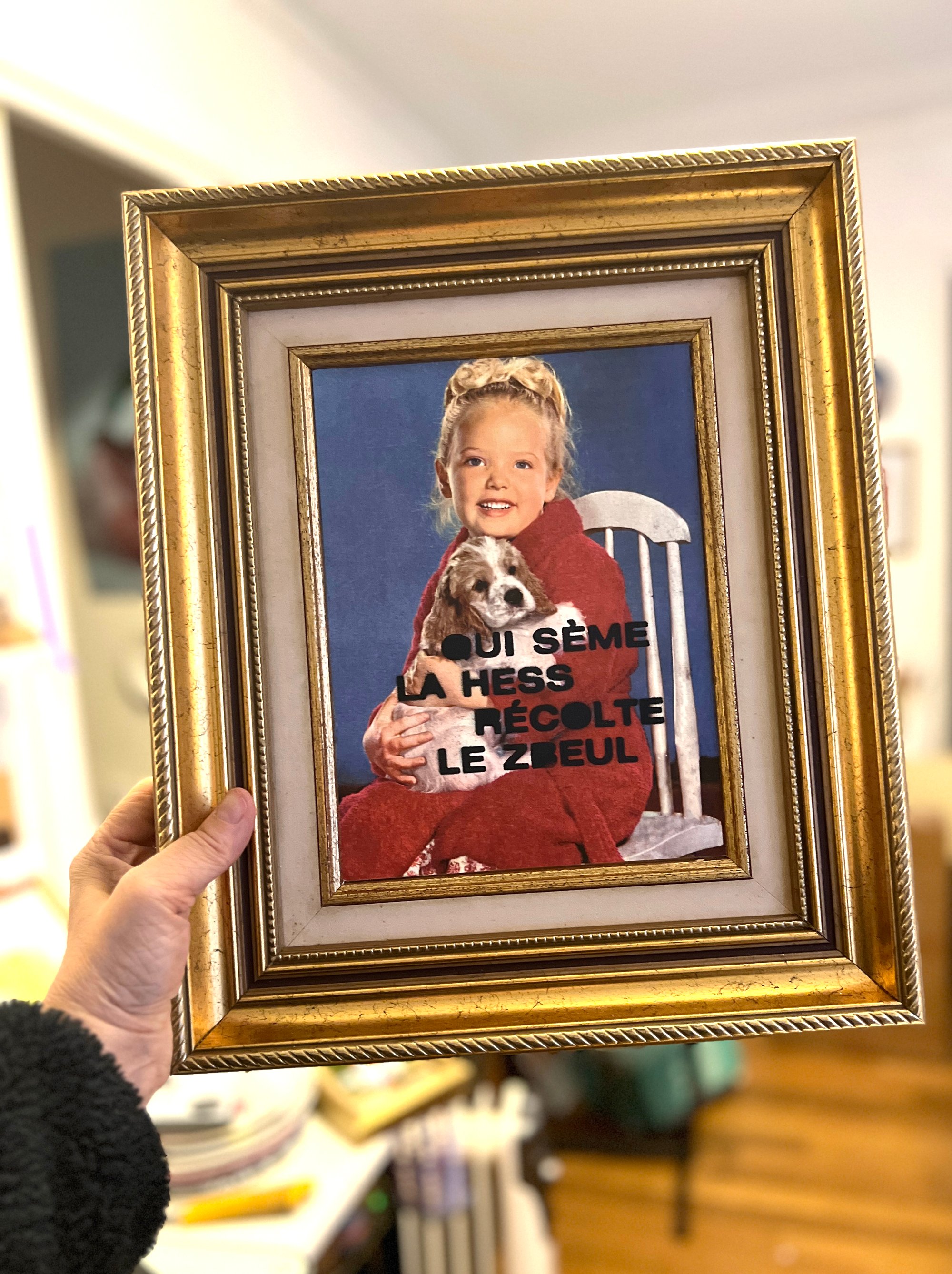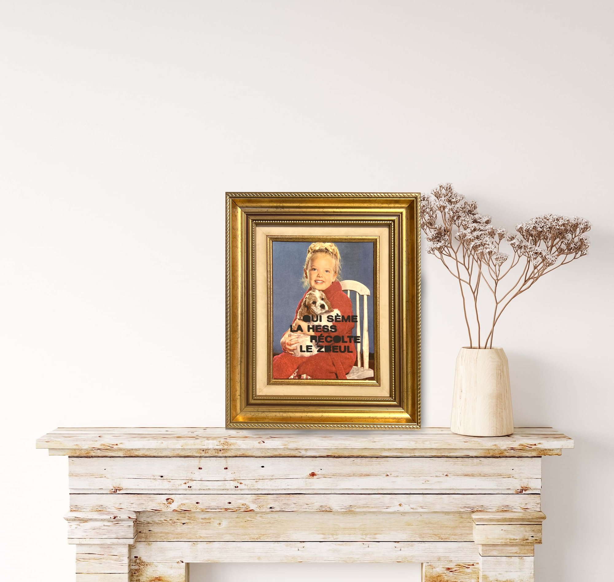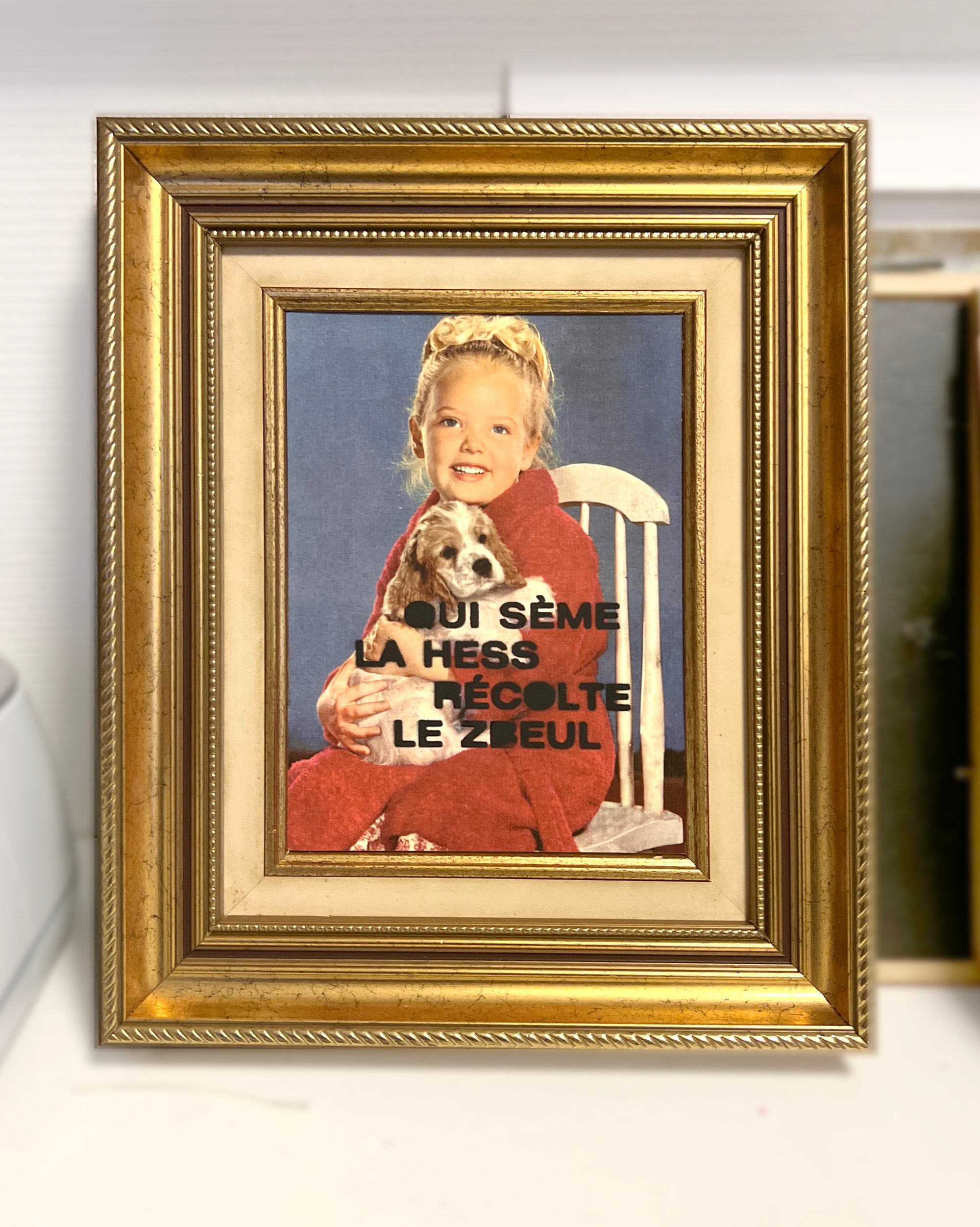 Image ancienne d'une petite fille et son chien avec le slogan QUI SÈME LA HESS RÉCOLTE LE ZBEUL réalisé avec un pochoir et de la peinture en bombe noire.