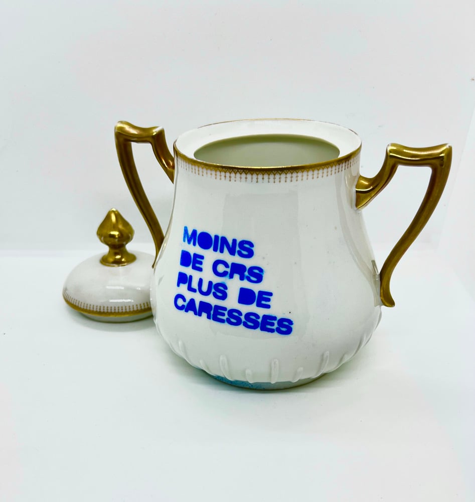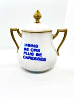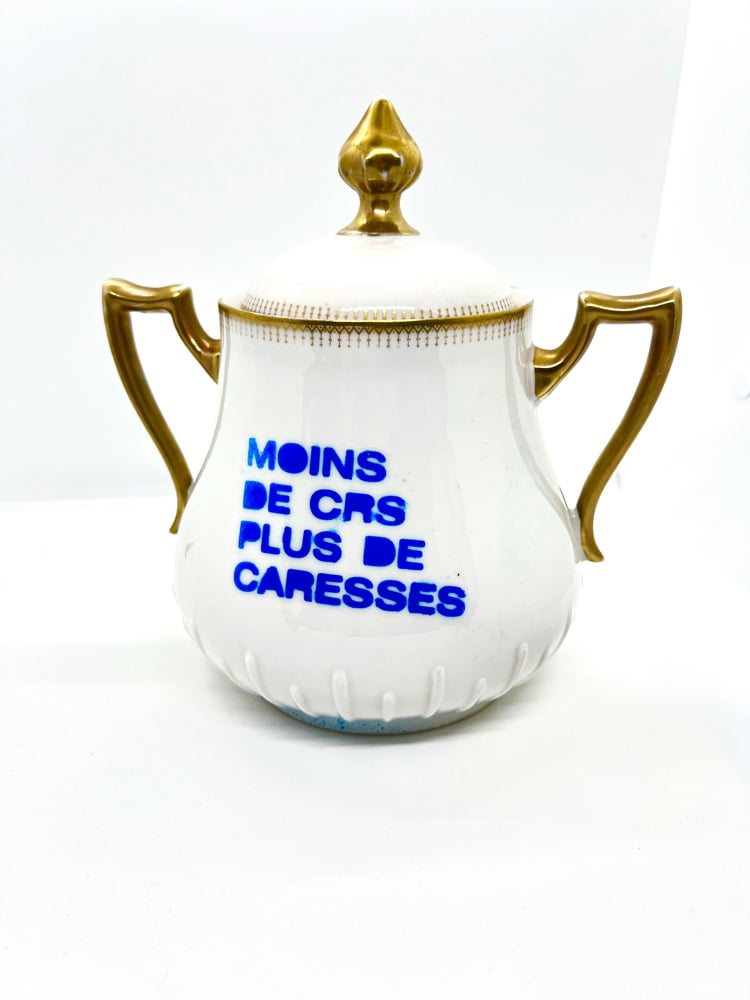 Pot en céramique avec le slogan MOINS DE CRS PLUS DE CARESSES de la Furieuse Company.