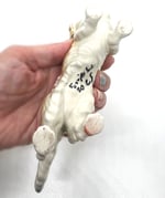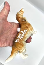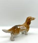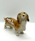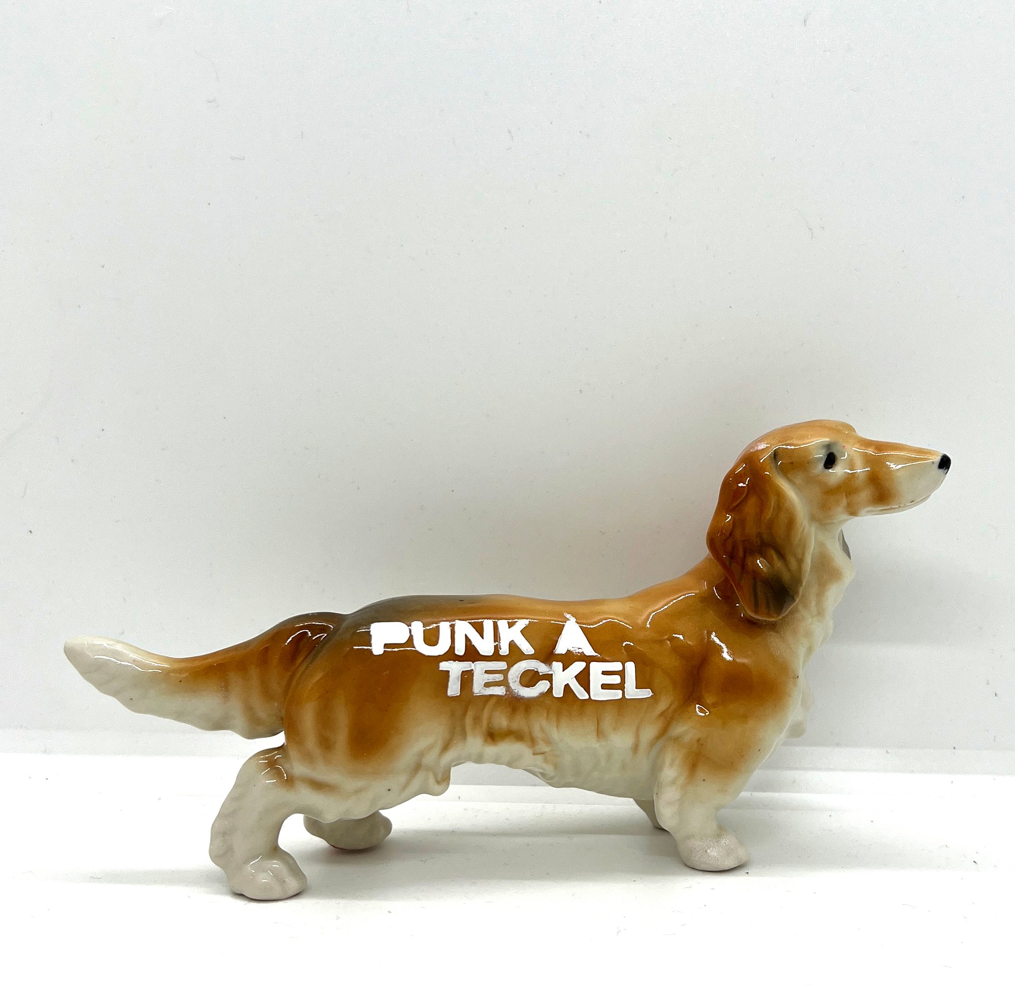 Très joli teckel en céramique avec le slogan PUNK À TECKEL de la Furieuse Company. Le slogan est réalisé au pochoir avec de la peinture en bombe blanche sur le dos de la petite bête.